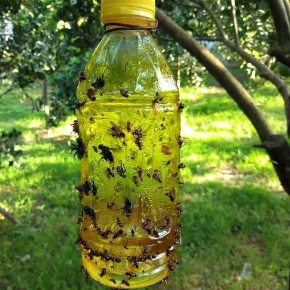 - Tốt nhất với những cây trưởng thành bạn nên treo 1 chai bẫy ruồi vang, trường hợp cây to bạn có thể treo 2 chai đã xịt như vậy.