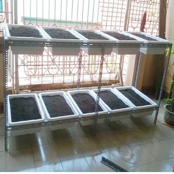 - Số tầng của kệ trồng rau: phổ biến nhất nhất là 2 tầng, bên cạnh đó có cả 1 tầng và 3 tầng. Cá biệt có khách hàng còn làm luôn kệ 4 tầng và bắc ghế để chăm sóc.