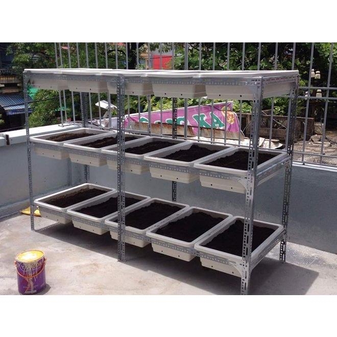 Là một loại kệ được lắp từ sắt v lỗ, hoặc hàn bằng sắt hộp, hoặc hàn bằng inox, giúp tạo ra 1 tầng, 2 tầng, 3 tầng,... hoặc nhiều hơn chưa các khay trồng rau. Giúp tối ưu diện tích, trồng được nhiều rau hơn, không gian gọn gàng sạch sẽ đẹp mắt, tạo thêm hứng thú cho người trồng rau sạch tại nhà.